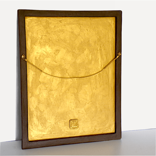 Treasured backside with gold structure paint and a handcrafted gold-clay Ordaz atelier logo label.